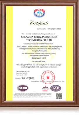 赫兹创新(HzI)以产品技术创新为企业发展的核心理念,公司打造了一支专业素质高、创新能力强的技术研发团队,主要研发成员来自国内知名大学无线充电技术研究团队以及该领域的知名企业,核心成员是国内无线电能技术研发及应用的开拓者。公司在无线电能传输效率提升、逆变控制和调节,大规模非接触供电网络,多对多无线充电、异物检测、防辐射、电气安全保护、应用创新等方面拥有核心技术,已获得33项发明专利授权、32项实用新型专利授权及8件软件著作权。公司把产品的可靠性和质量视为企业发展根本,无论在研发和生产上都以质量优先,公司通过了ISO 9001质量认证体系,产品通过了SEMI、CE、TUV、FCC等认证,公司还通过了ISO14001等标准的认证。